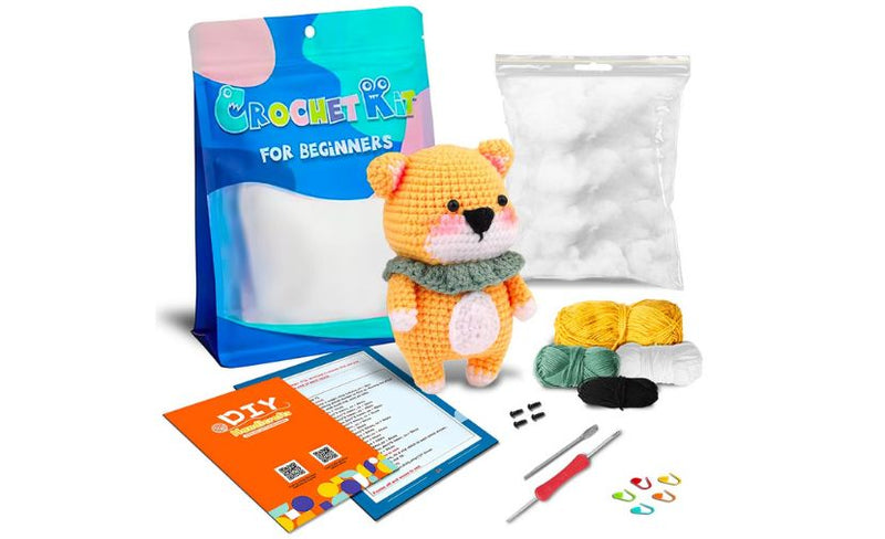 Alt-i-ett-heklesettet inneholder: en heklenål med dobbel spiss, maskemarkører, en stump nål til å feste øynene med, kunstige øyne, mykt fyllmateriale, ulike garntyper, en grundig guidebok og en praktisk bæreveske til hele settet.