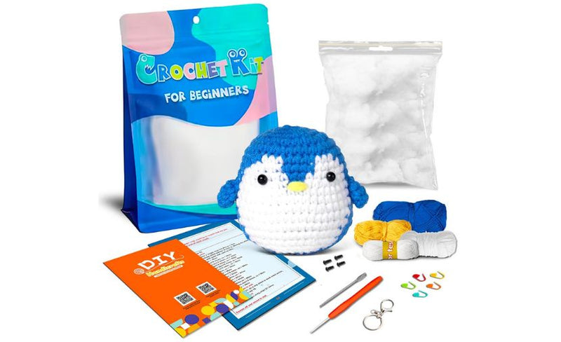 Alt-i-ett-heklesettet inneholder: en heklenål med dobbel spiss, maskemarkører, en stump nål til å feste øynene med, kunstige øyne, mykt fyllmateriale, ulike garntyper, en grundig guidebok og en praktisk bæreveske til hele settet.