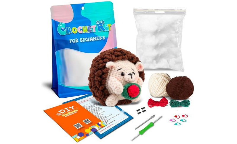 Alt-i-ett-heklesettet inneholder: en heklenål med dobbel spiss, maskemarkører, en stump nål til å feste øynene med, kunstige øyne, mykt fyllmateriale, ulike garntyper, en grundig guidebok og en praktisk bæreveske til hele settet.