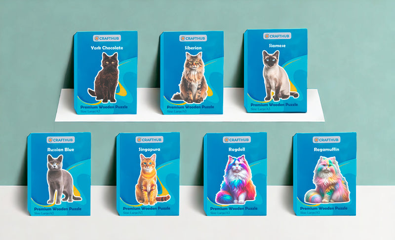 Gå på oppdagelsesferd i en omfattende feiring av kattens skjønnhet med puslespillet vårt i tre, som viser over 50 unike katteraser fra hele verden.