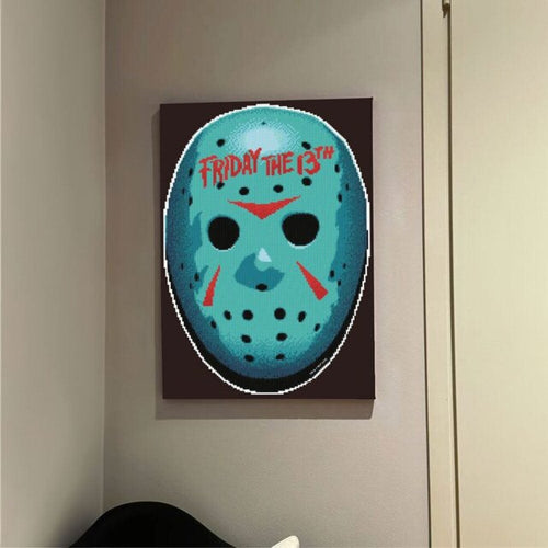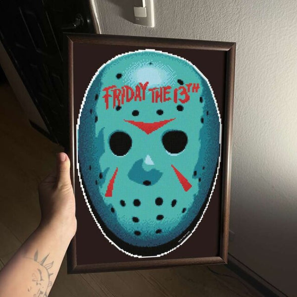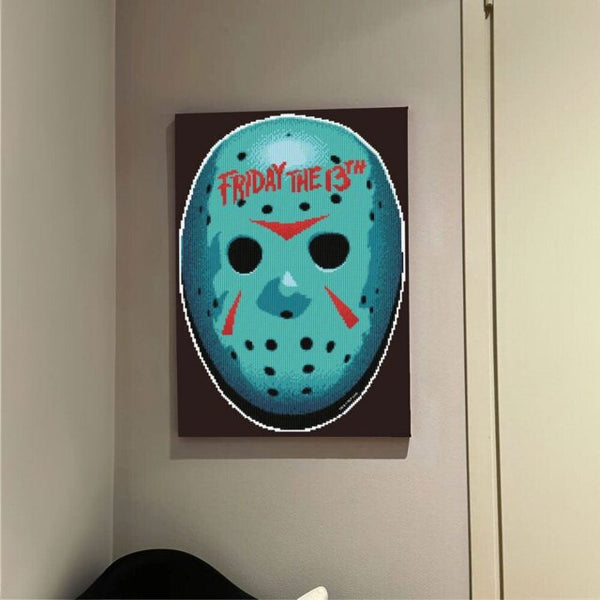 Jeg elsket hvor rent og grafisk dette designet ble. Selve settet var lett å jobbe med: klebrig lerret, tydelig diagram og ingen manglende diamanter. Nå stirrer Jason på meg fra veggen, og ærlig talt er det den kuleste samtalestarteren.